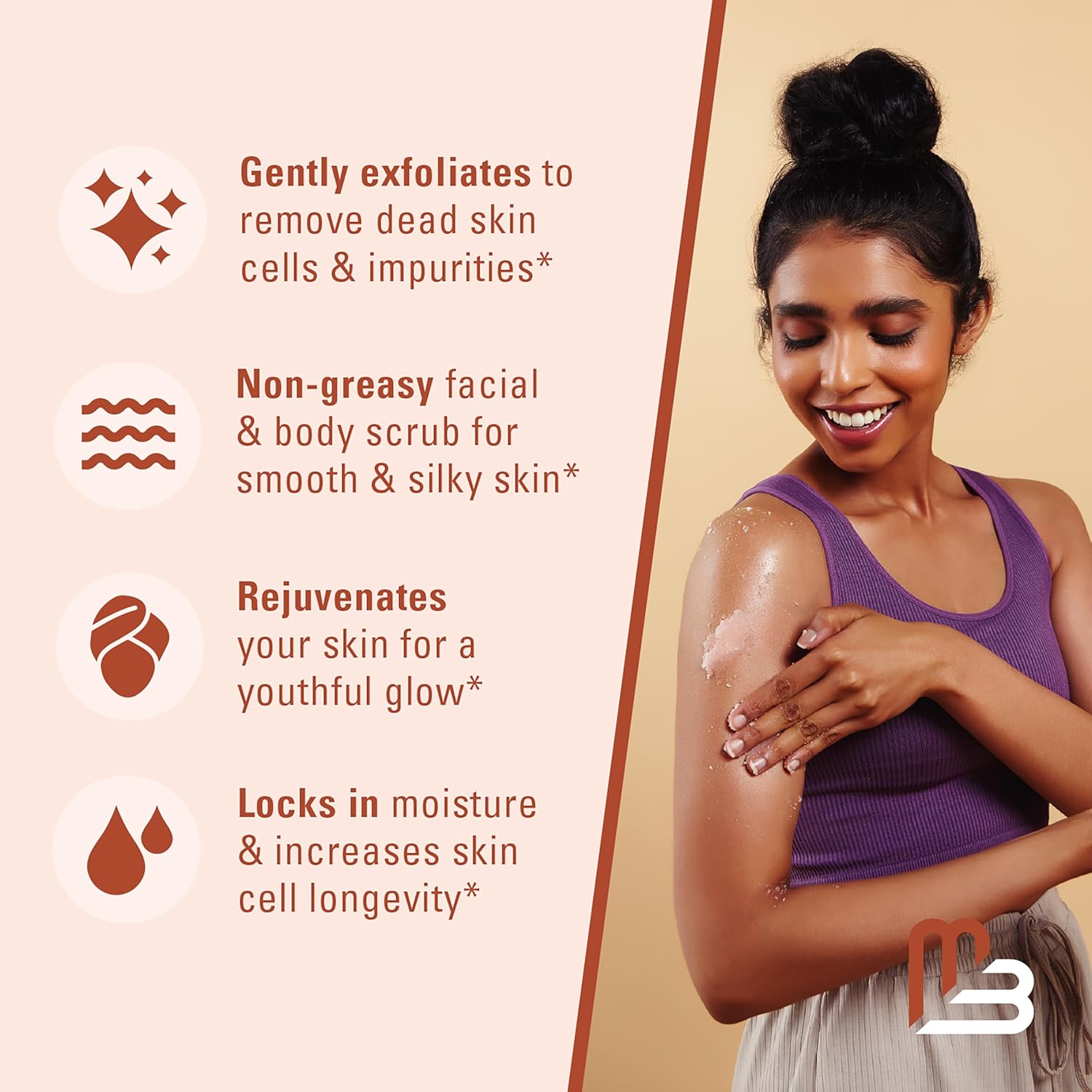 • M3 Himalayan Body Scrub: Enjoy the best exfoliating experience not only as a body scrub but also a facial scrub, hand scrub, or foot scrub. Moisturizing and rich in antioxidants, our Himalayan salt with Jojoba oil will help restore your skin while scrubbing away unwanted toxins and dead skin cells! *