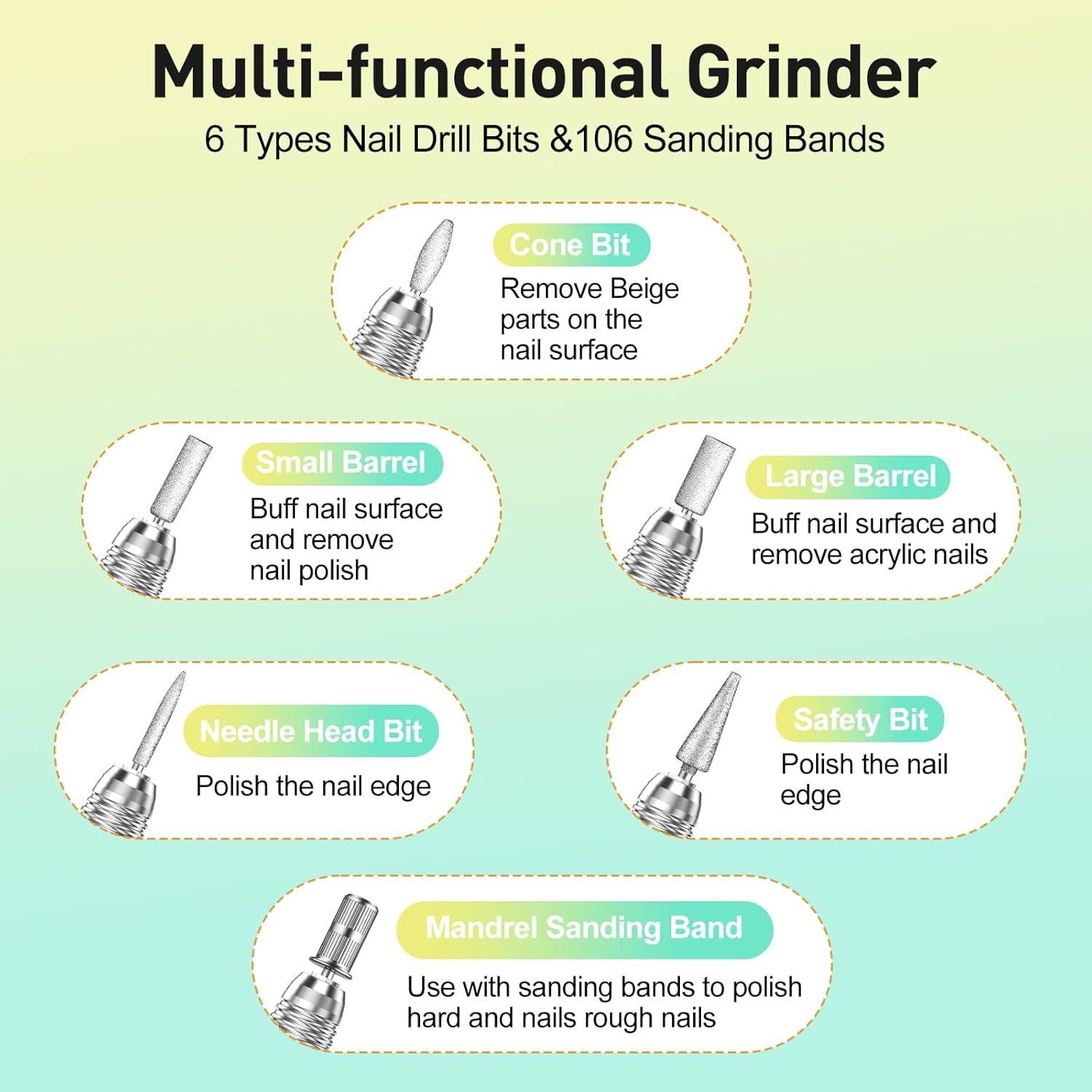 - Practical: Equipped with 6 optional metal nail drill bits and 100 pcs sanding bands, make your manicure and pedicure easier.If you have any problems with our product, please do not hesitate to contact us and we will response you in 24 hours and try our best to assist you find a prompt solution