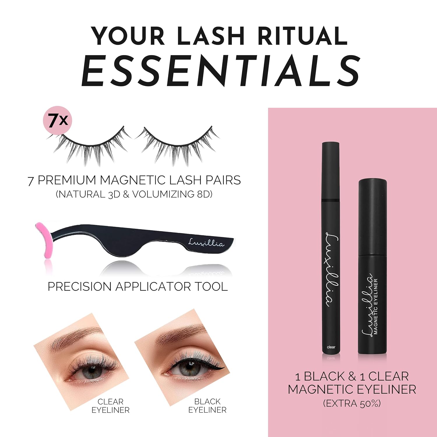 Luxillia Magnetic Eyelashes Kit โ 10 Piece (Clear & Black) Magnetic Eyelash & Eyeliner Set with Applicator โ Natural Look Easy Apply Reusable Fake Extension Lashes, No Glue โ Pestaรฑas Naturales
