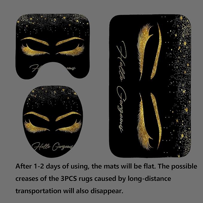 4PCS Unicorn Eyelash Shower Curtain Set, Luxury Gold Glitter Eyebrow Makeup Confetti Hello Gorgeous Glam Modern Fashion Black Women Bathroom Decor, Non-slip Bath Mat Toilet Rug, Gold Eyelash