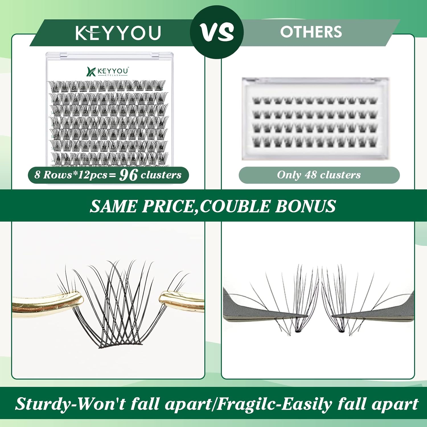 - 【Soft&Comfortable】KEYYOU lash cluster are made of imported materials,the stem line is thinner and softer, the eyelash cluster are lighter and more comfortable to wear.96 clusters in one tray ,more cost-effective.