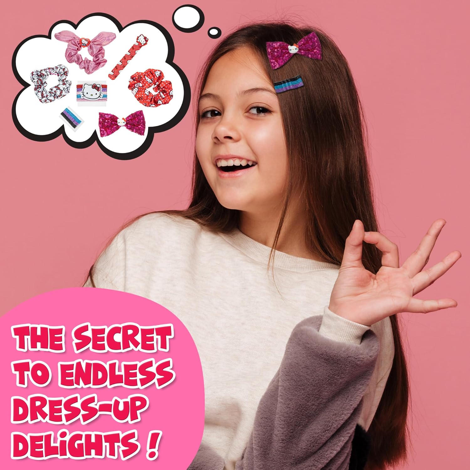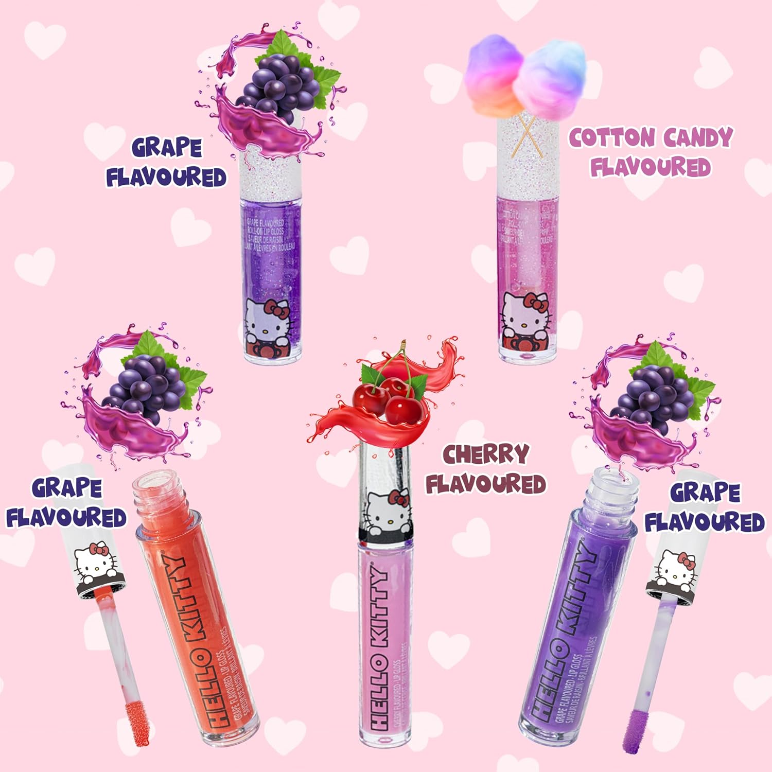 - KIT INCLUDES: 5-well eyeshadow of bright colors. 4 peelable, bubble gum scented nail polishes, 1 blush compact, 3 lip glosses scented in grape, cherry, and cotton candy, 1 cotton candy 5-well lip gloss, 2 roll-on lip glosses, flavored grape and cotton candy, 2 scrunchies, 1 hair bow, other hair accessories, 2 toe spacers, 1 nail and other nail accessories.