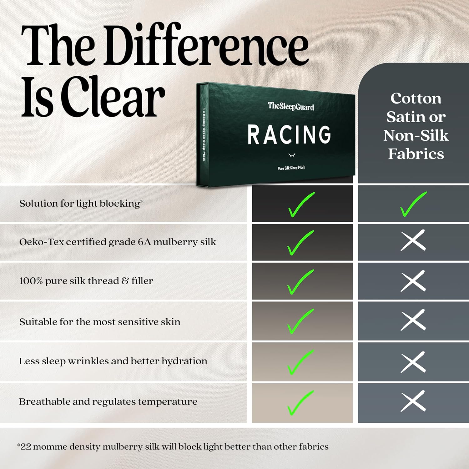 - โ INVEST IN YOUR SLEEP - Experience TheSleepGuard difference with our luxury sleeping masks. Crafted from the highest grade 6A Mulberry silk at 22 momme and certified by Oeko-Tex to ensure you sleep soundly. Remember, better sleep leads to a better you.