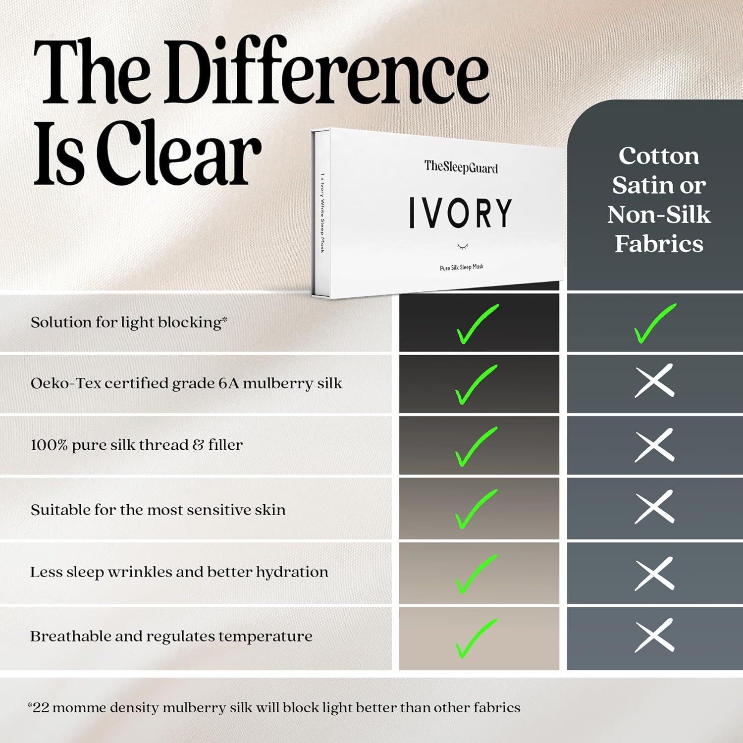 - โ INVEST IN YOUR SLEEP - Experience TheSleepGuard difference with our luxury sleeping masks. Crafted from the highest grade 6A Mulberry silk at 22 momme and certified by Oeko-Tex to ensure you sleep soundly. Remember, better sleep leads to a better you.