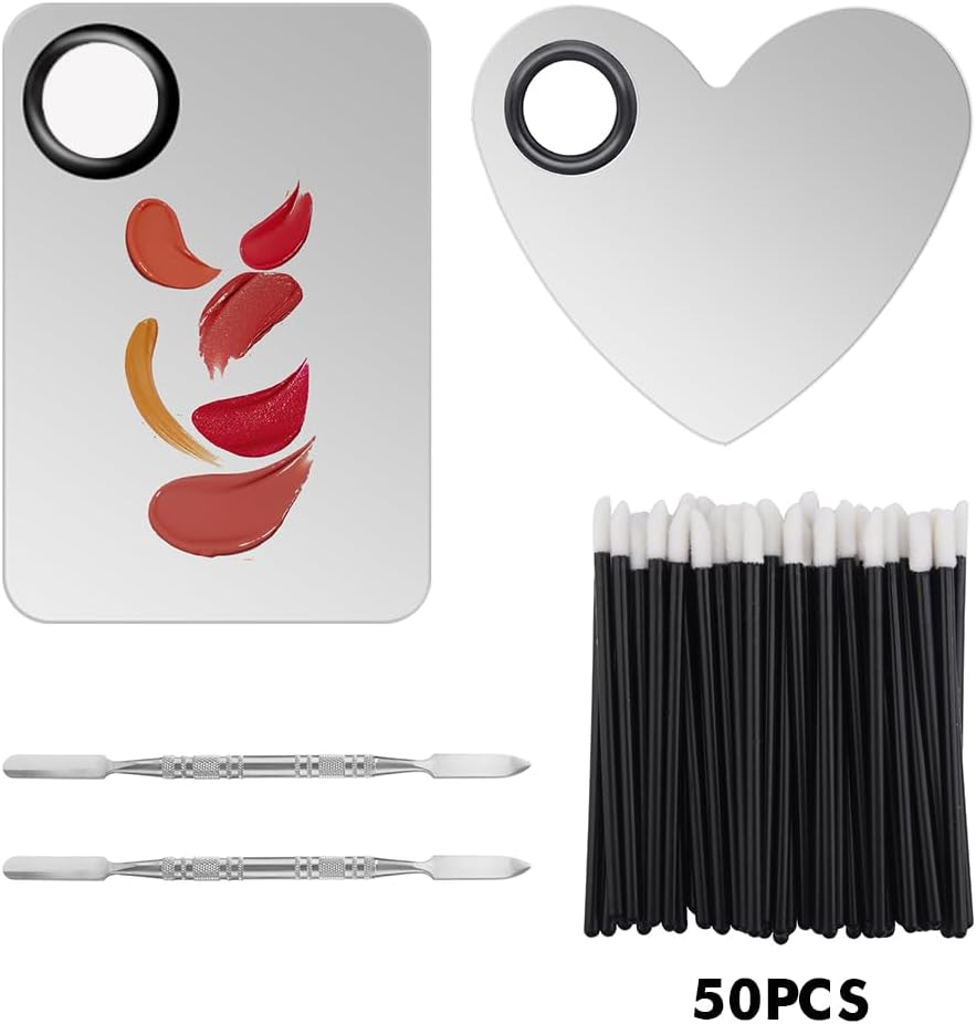 - 【PACKAGE CONTENT】You will receive 2pcs spatulas, 1pc heart-shape makeup mixing palette, 1pc rectangle makeup mixing palette and 50pcs disposable lip brushes, enough for your daily makeup needs.