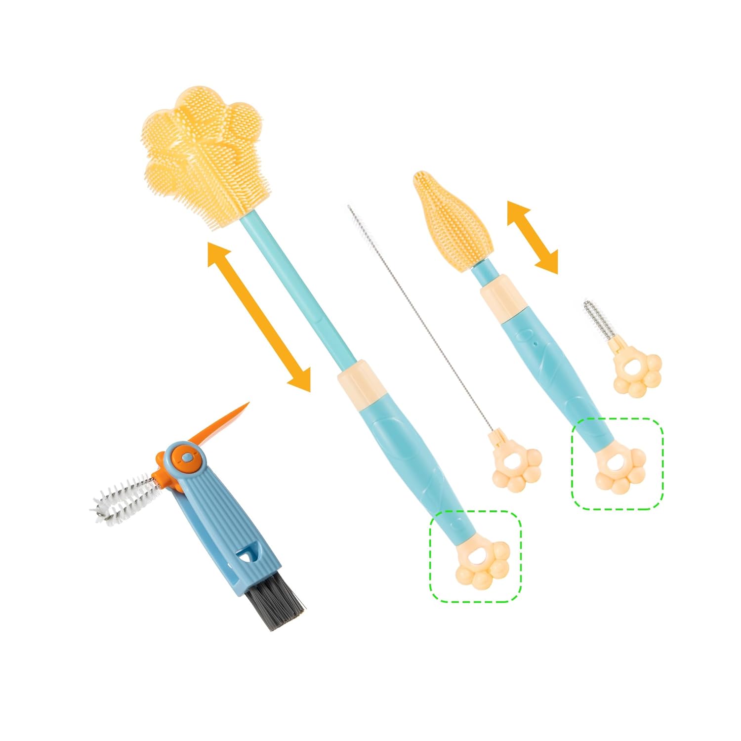 - This product has 3 parts. 1 Pawprint silicone brush and 1 silicone Nipple/Pacifier brush that can adjust the extension length according to needs. Besides, with 1 multifunctional Tiny Cup Lid Gap Cleaning Brushes.