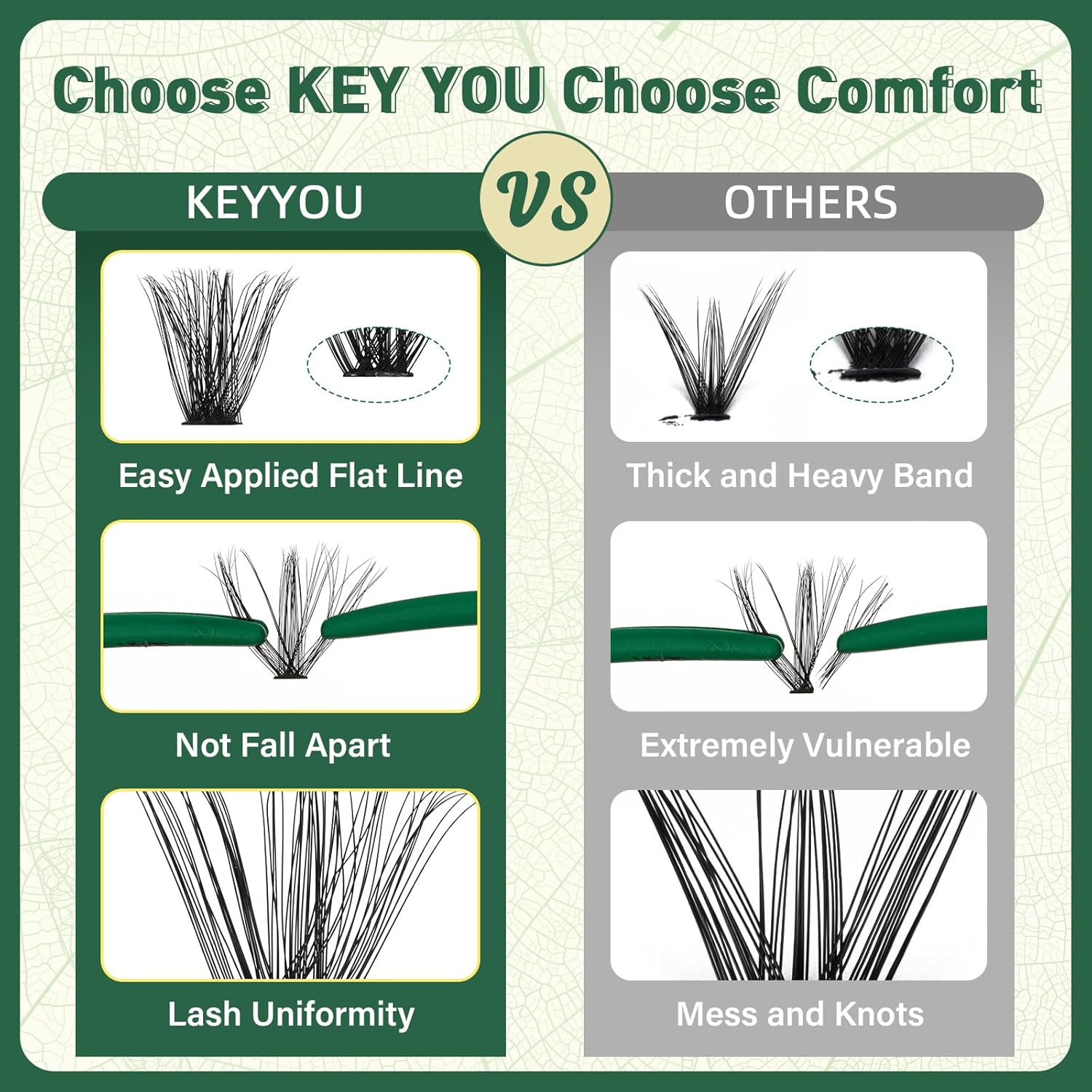 - 【Super Soft&Comfortable】KEYYOU new lash clusters made with softer updated materials, it is lighter and more comfortable to wear, and can be worn all day without burden, making the beauty last longer.The lashes clusters with super thin roots allow you to better fit your natural eyelashes.