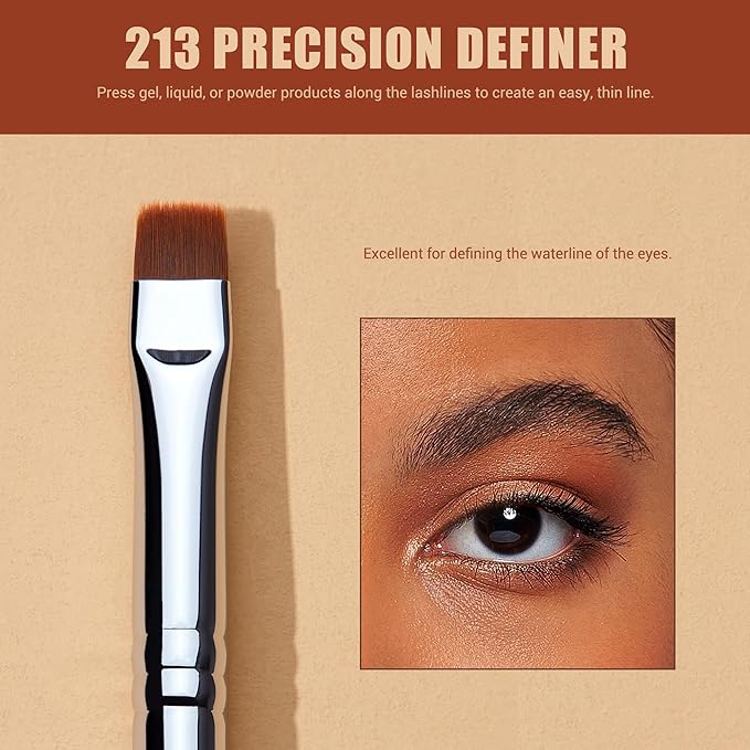 - 213 Precision Definer: Ues this flat eyeliner brush to press gel, liquid, or powder products along the lashlines to create an easy, thin line. Excellent for defining the waterline of the eyes.