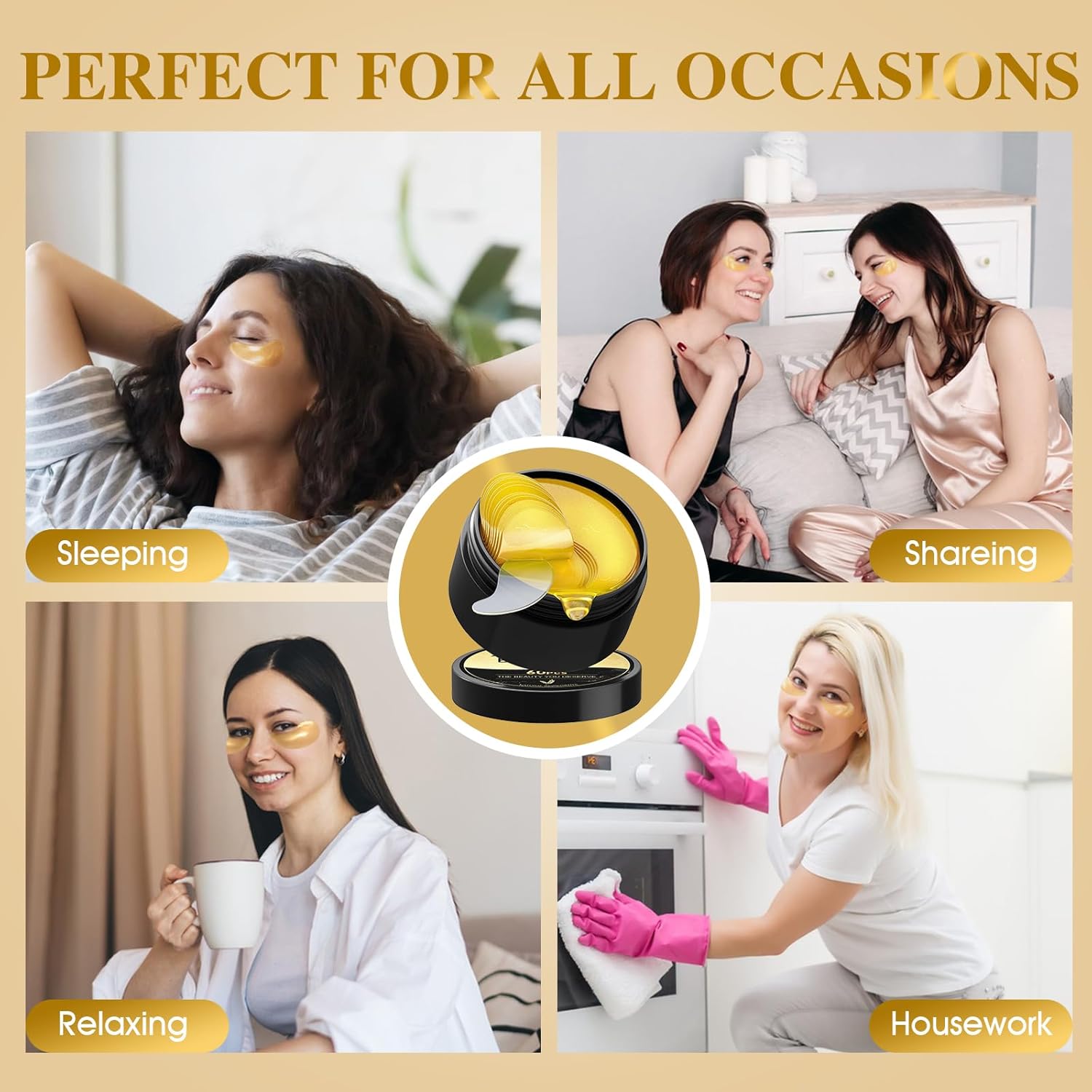 - 【24k Gold Under Eye Patches】Our 24k gold collagen eye mask is an efficient eye skin care treatment method,using these eye masks daily will reduce eye puffiness,eye bags,eliminate wrinkles and dark circles.You can also share these under eye patches with friends and family,doubling your happiness.