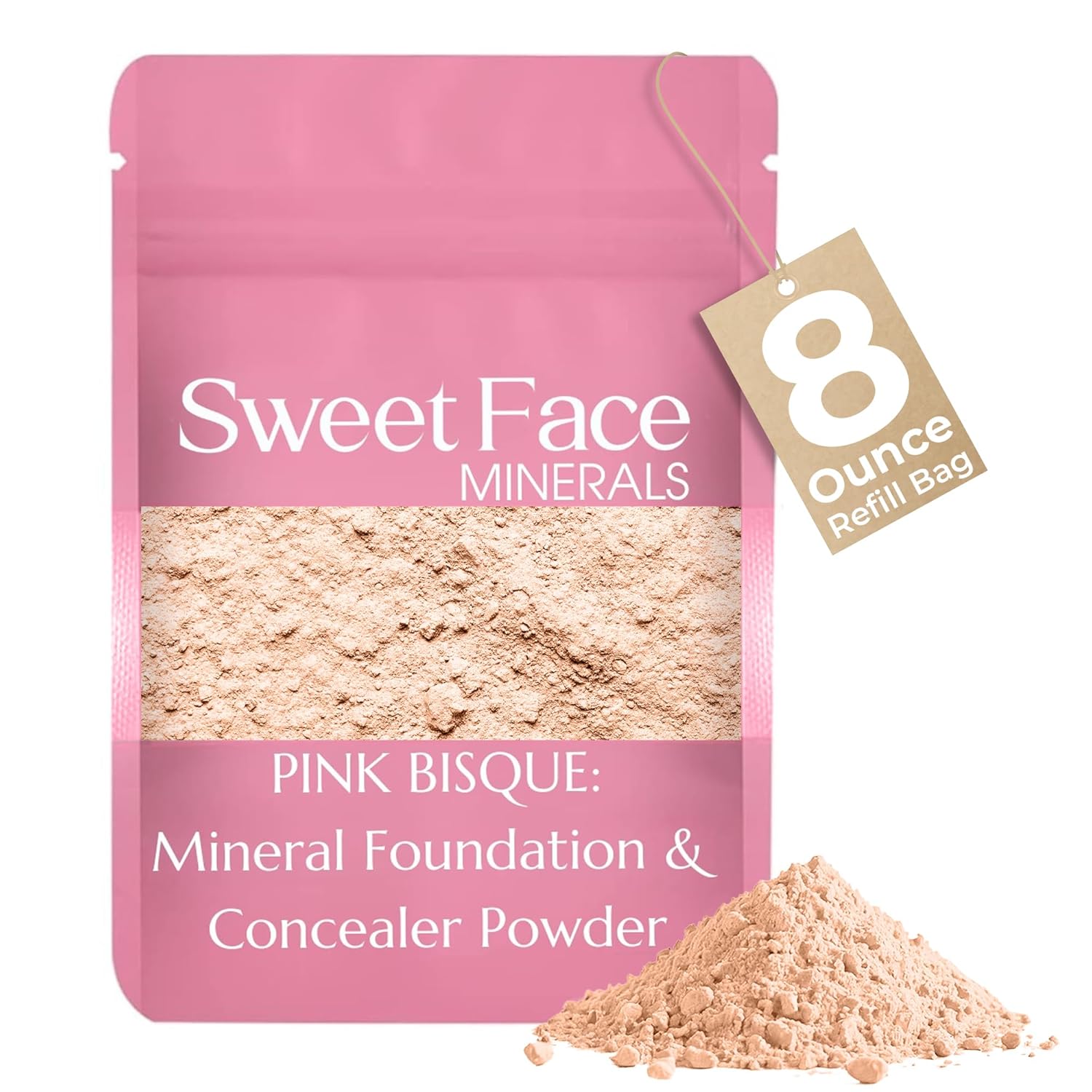 Foundation Powder Refill (Pink Bisque)(8 Ounce Bag) By Sweet Face Minerals, Lightweight Mineral Loose Makeup Powder with SPF 20, Full Coverage Flawless Finish, Talc-free, Cruelty-Free, Refill Pouch