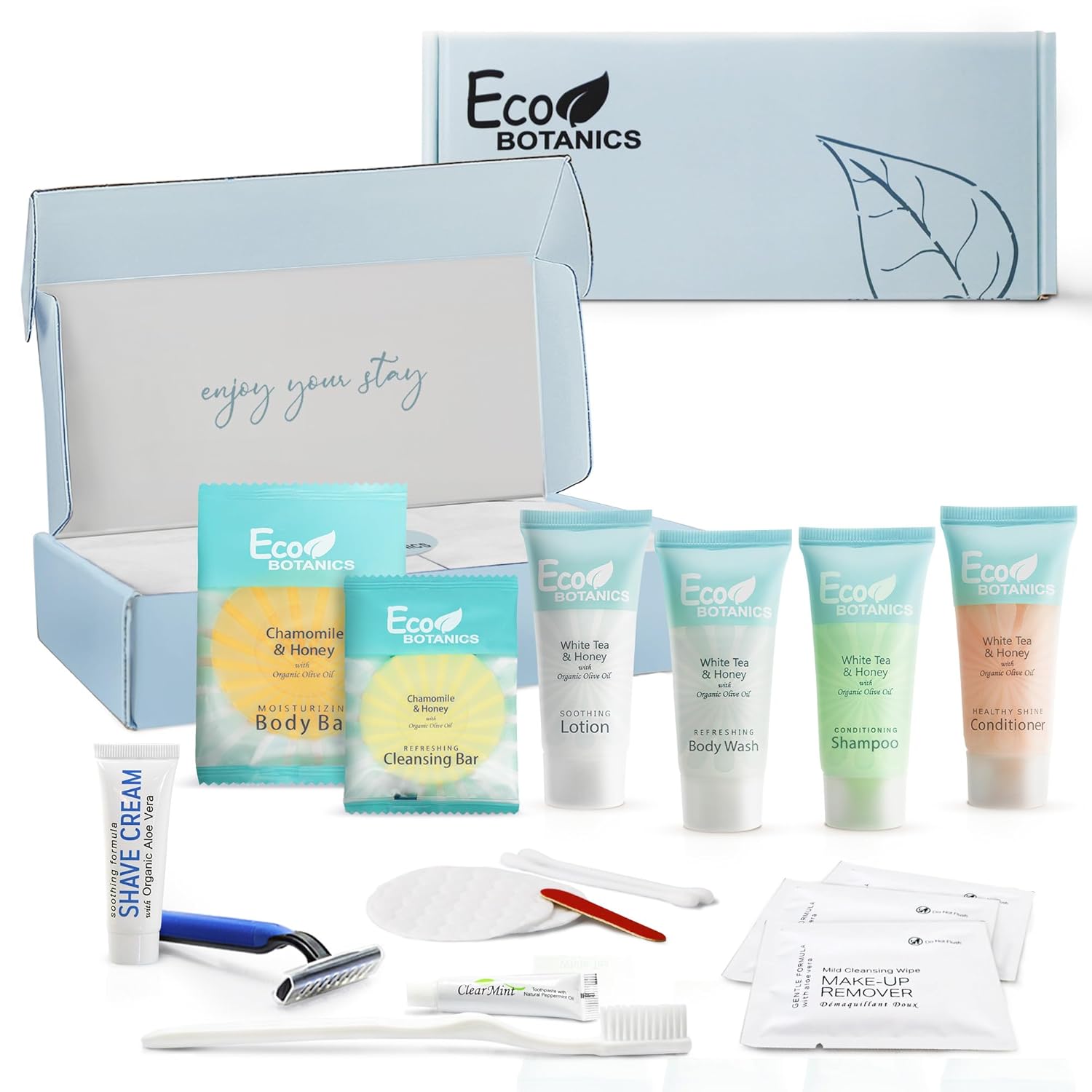 Eco Botanics Amenity & Accessory Kit | 0.85 oz Travel Size Shampoo, Conditioner, Lotion, Body Wash, Body Bar, Cleansing Bar, Shave & Dental Sets, Make-Up Remover Wipes, & Vanity Kit | 1 set per case