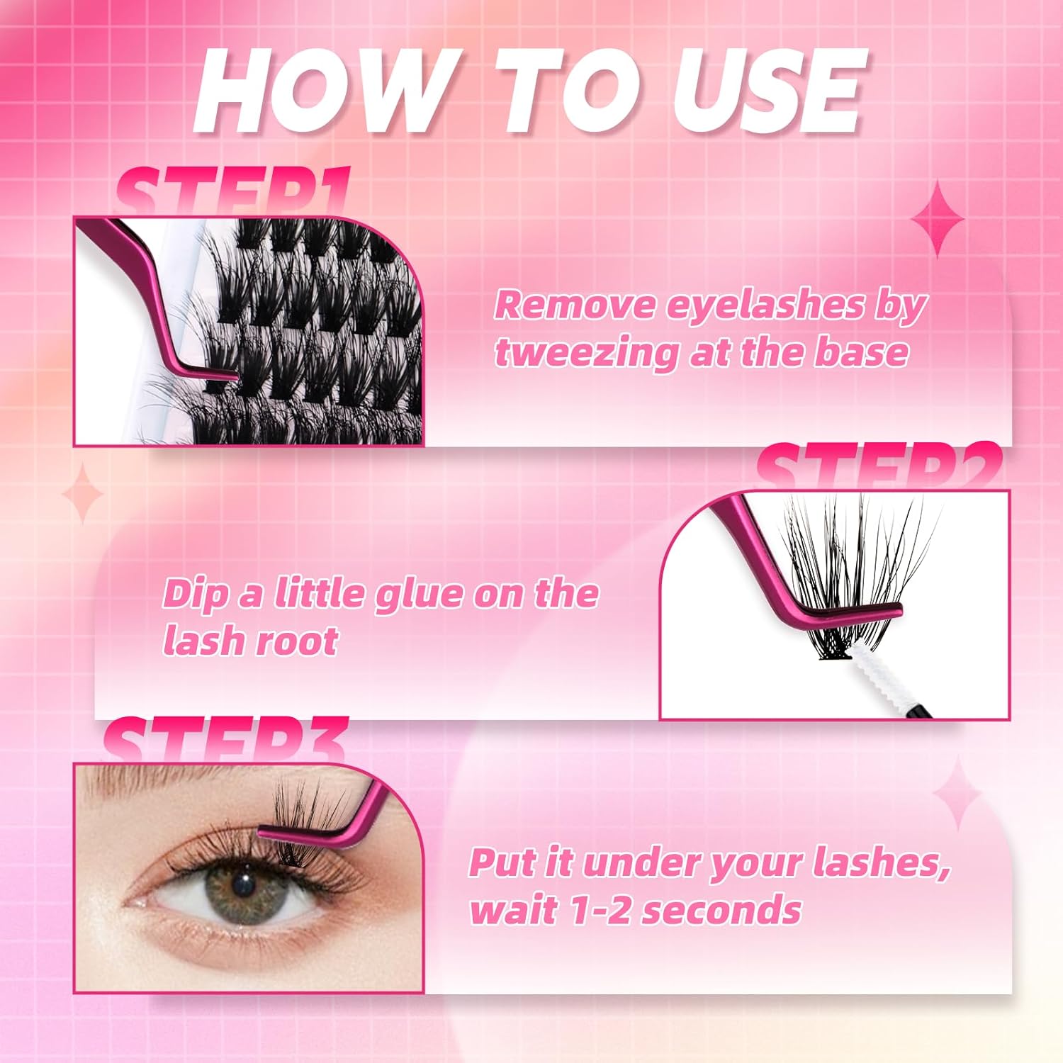 - DIY individual clusters at home: Step 1: Gently curl your lashes. Step 2: Pick up the lash clusters with lash tweezer. Step 3: Apply cluater lash glue. Step 4: Wear cluster lashes according to your preference.