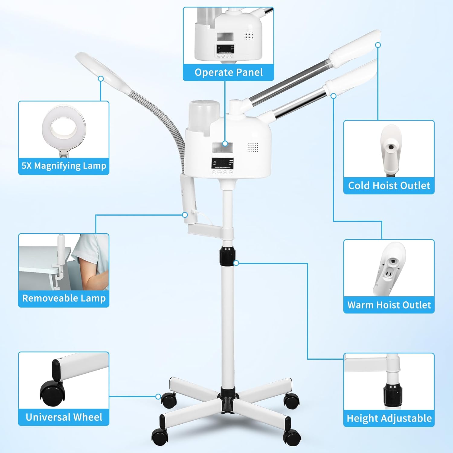 - GREAT QUALITY - Steamer for face spa on wheels,high quality warm stainless steel pipe, sturdy and durable, high capacity water cup, can store 1000ml water, the steamer generates the mist quickly with 1-3mins,the head of the machine is free to rotate 360°. Adjustable height from 38.1" - 48"