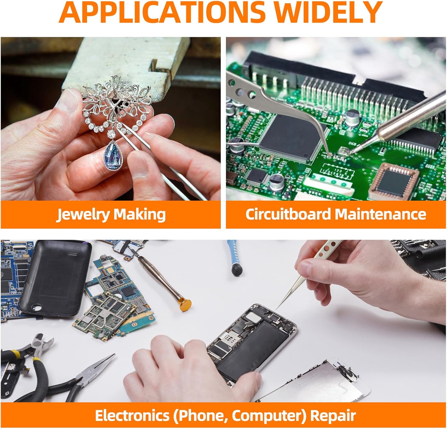 - ā FEITA multifunctional tweezers set has 5 types of tweezers, which suit for Electronics Repair, Craft, Jewelry, Soldering, Lab work, Model making, Stamp or coin collecting, Weeding vinyl design, Ingrown hair removal, Eyelash extension, Eyebrow removal, Paper Sculptures, Embroidery, Phone repair, Watch repair, Cameo, Diamond Painting, eyeglass, apparatus, etc.