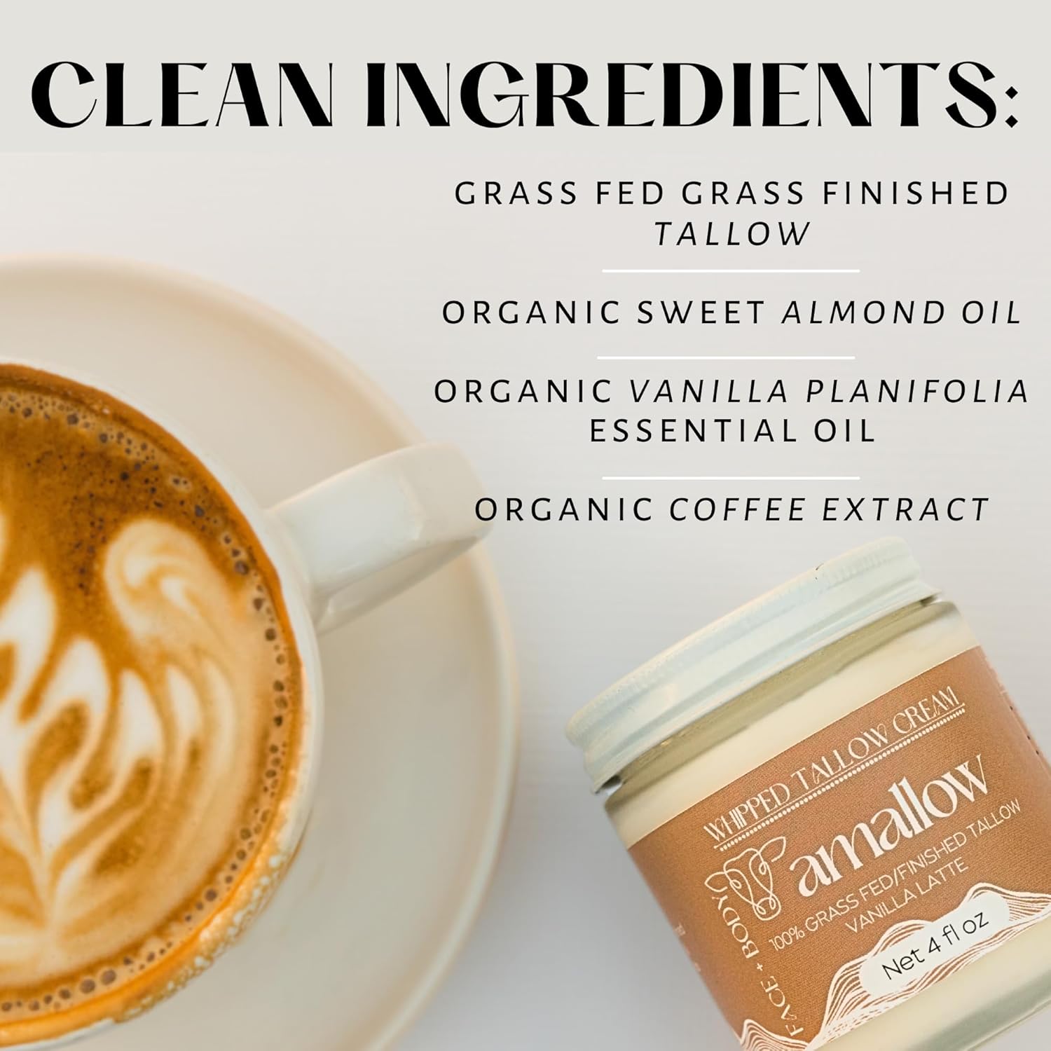 Amallow 100% Grass Fed Beef Tallow for Skin Care - Face + Body - Whipped Moisturizer - Natural Lotion, 4 FL. oz. (Vanilla Latte)