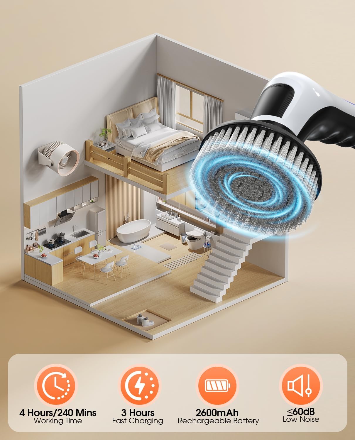 - FAST CHARGING & LONG WORKING TIME -The tile scrubber for bathroom shower uses a new 8-level circle-type battery display screen.The floor scrubber is equipped with a 2600mAh rechargeable battery,providing 240 minutes of continuous work after only 3 hours of fast charging. The package of tornado scrub includeds type-C charging cable and wall hook to save valuable space for your home.