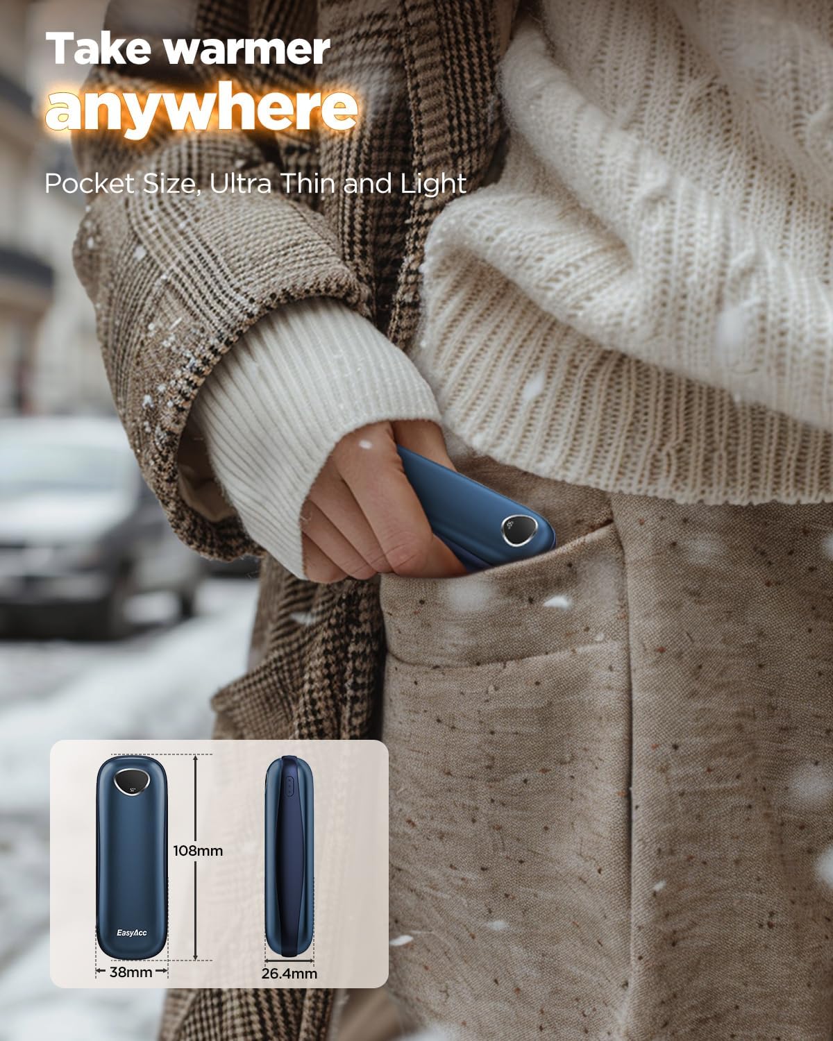 - 【The Palm-Friendly Design】: After 3 years of research, EasyAcc launched the most suitable hand warmers rechargeable for palm grip, perfect fit in the palm of your hand, Ergonomic design is comfortable to hold. The perfect winter companion for you and your Lovers!