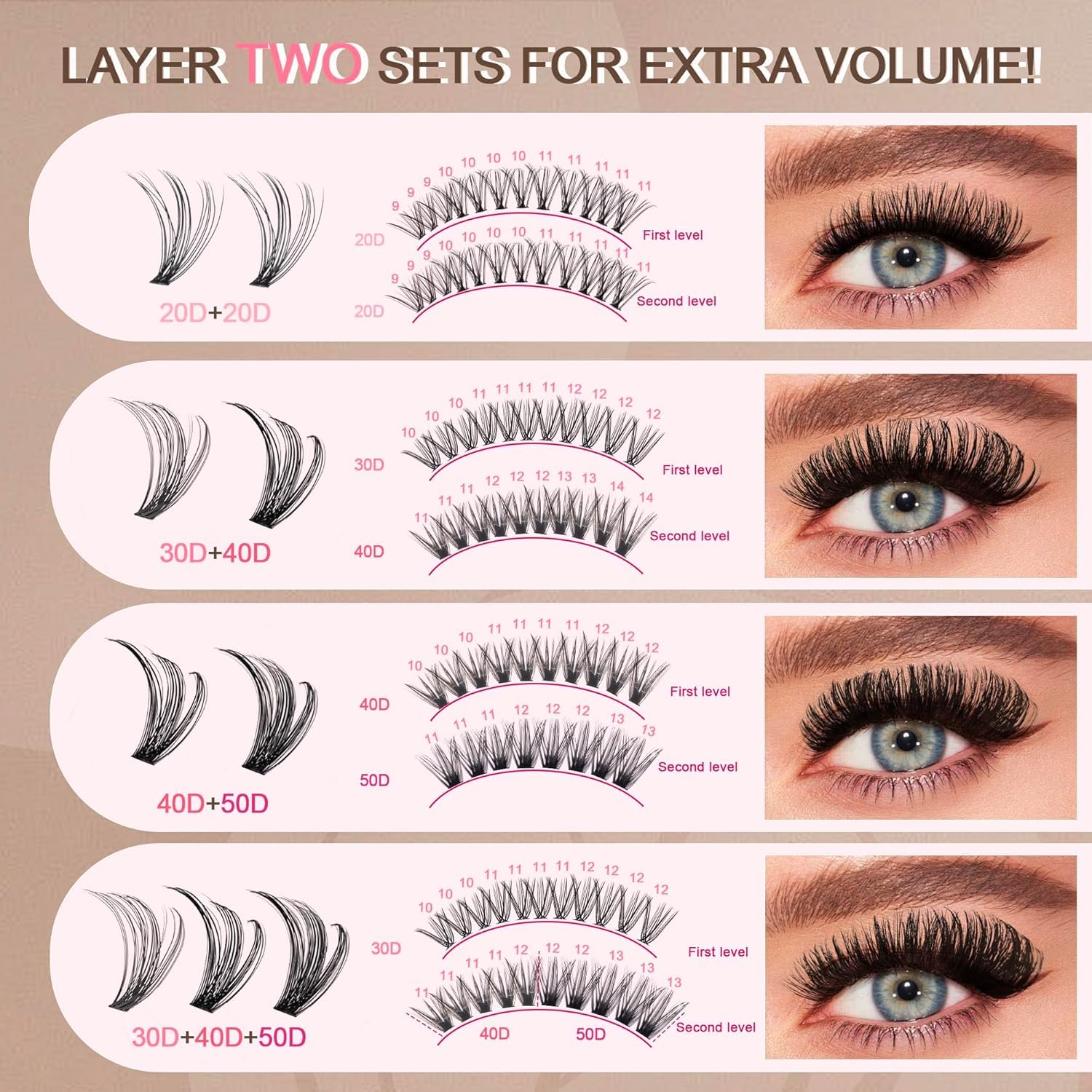 - Build Your Signature Look 20D-50D Customizable Volume System: Mix 4 iconic densities (20D eyelash clusters for barely there wisps, 30D for office chic, 40D for date-night drama, 50D for stage-ready volume) to create 7+ salon-level styles.20D= Density | Each cluster contains 20 ultra-fine strands (0.07mm tapered tips) featherweight fan shapes - equivalent to 2-3 natural lashes per cluster. Our cluster lashes clusters look real and have gorgeous results
