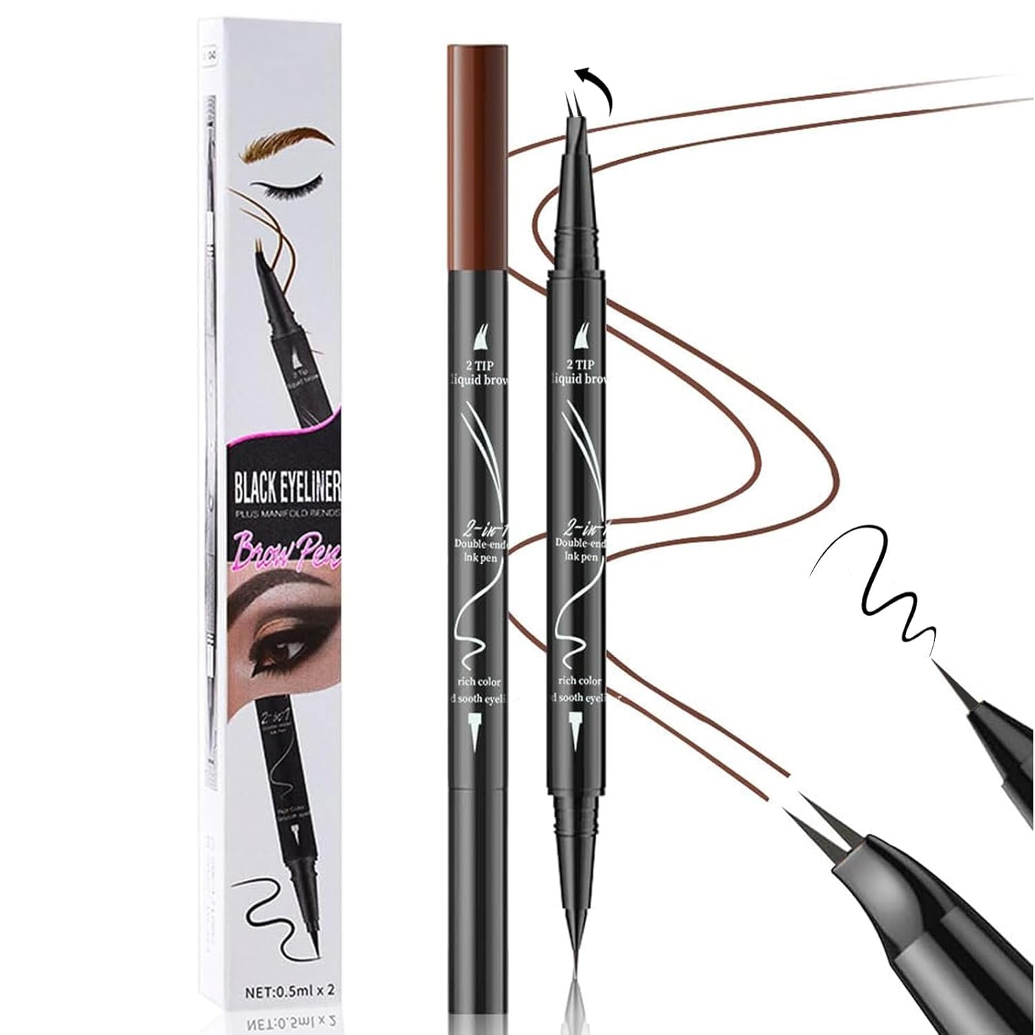 Curved 2 Tip Eyebrow Pen-Light Brown Eyebrow Pencil With Black Eyeliner 2-in-1 Dual-Ended Create Natural Hair-Like Brows,Waterproof,Smudge Proof,Long Lasting All-Day