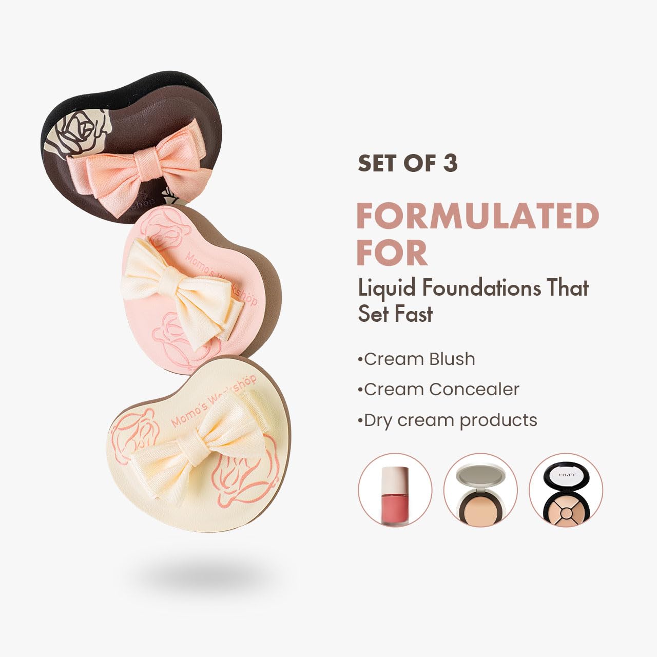 - ăSecure Bow Tie Strapă This set includes three makeup sponges in different colors. The back strap features a bow-like tie for a secure, non-detachable finish. The textured surface prevents slipping during use.